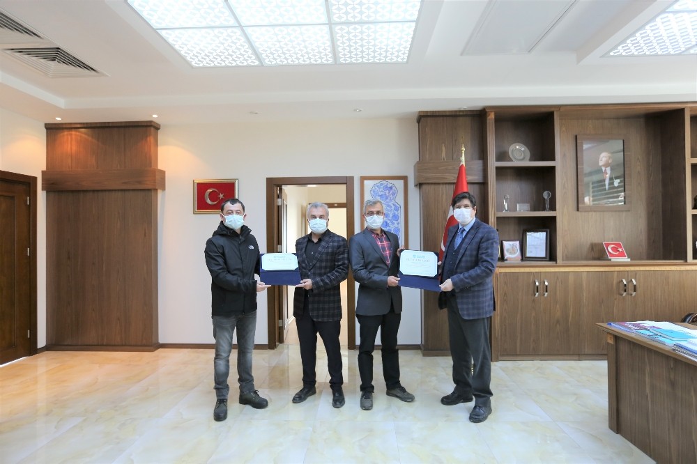 BEÜ Rektörü Prof. Dr. Erdal Necip Yardım, TÜBİTAK tarafından yayınlanan “Üniversitelerin Alan Bazlı Yetkinlik Analizi” çalışmasına göre üniversitede başarı elde eden bölümler adına, sırasıyla en yetkin bölümler olan arkeoloji ve tarih bölümlerinin bölüm başkanlarını makamında kabul etti. Ziyarette Arkeoloji Bölüm Başkanı Doç. Dr. Yunus Levent Ekinci ve Tarih Bölüm Başkanı Doç. Dr. Fatih Gencer’in yanı sıra Fen Edebiyat Fakültesi Dekanı Prof. Dr. Mehmet Demirtaş da hazır bulundu. Rektör Prof. Dr. Yardım, her iki bölüm başkanını tebrik etti. Başarılarının devamını dileyen Rektör Yardım, Doç. Dr. Ekinci ve Doç. Dr. Gencer’e teşekkür belgesi takdim etti.