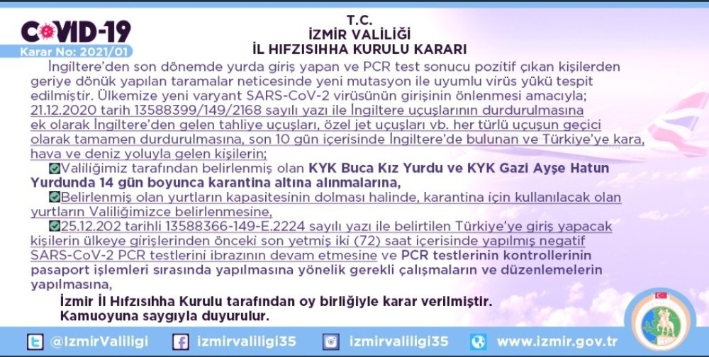İzmir Valiliğinden yapılan açıklamada, İngiltere’den son dönemde yurda giriş yapan ve PCR test sonucu pozitif çıkan kişilerden geriye dönük yapılan taramalar neticesinde yeni mutasyon ile uyumlu virüs yükünün tespit edildiği belirtilirken, Türkiye’ye yeni varyant SARS-CoV-2 girişinin önlenmesi amacıyla İngiltere’den gelen uçuşların durdurulduğu hatırlatıldı. Bu kapsamda, İl Hıfzıssıhha Kurulunun yaptığı toplantıda alınan karar Valiliğin sosyal medya hesabından duyuruldu. Açıklamada, “Son 10 gün içerisinde İngiltere’de bulunan ve Türkiye’ye kara, hava ve deniz yoluyla gelen kişilerin, valiliğimiz tarafından belirlenmiş olan KYK Buca Kız Yurdu ve KYK Gazi Ayşe Hatun Yurdunda 14 gün boyunca karantina altına alınmalarına, belirlenmiş olan yurtların kapasitesinin dolması halinde, karantina için kullanılacak olan yurtların Valiliğimizce belirlenmesine ve Türkiye’ye giriş yapacak kişilerin ülkeye girişlerinde önceki son (72) saat içerisinde yapılmış negatif SARS-CoV-2-PCR testlerini ibrazının devam etmesine ve PCR testlerinin kontrollerinin pasaport işlemleri sırasında yapılmasına yönelik gerekli çalışmaların ve düzenlemelerin yapılmasına karar verilmiştir” denildi.