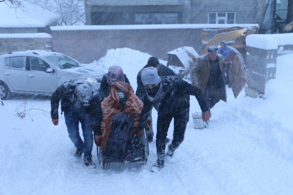 Van’ın Erciş ilçesinde etkili olan yoğun kar yağışı ve tipi nedeniyle evlerine ulaşamayan hastaların imdadına belediye ekipleri yetişti.