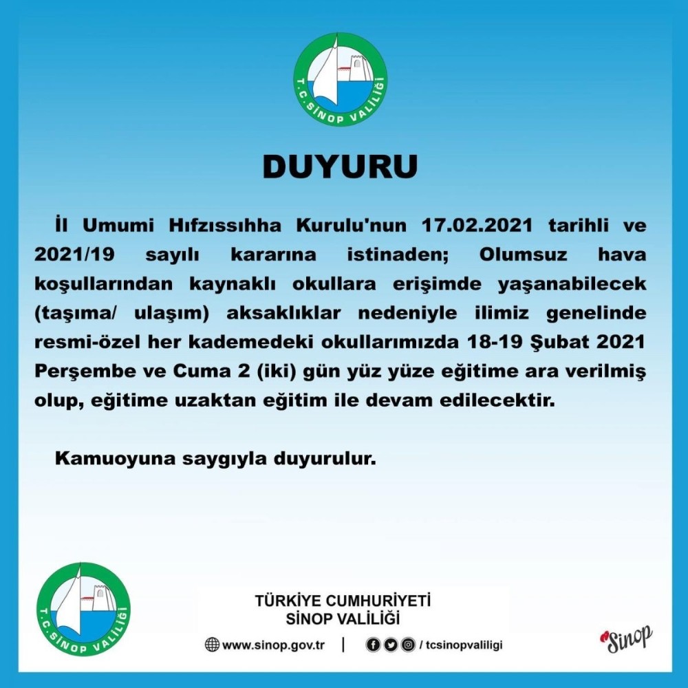 Valilikten yapılan yazılı açıklamada, il genelinde 18 Şubat Çarşamba ve 19 Şubat Perşembe günü olumsuz hava koşullarından kaynaklı okullara erişimde yaşanabilecek aksaklıklar nedeniyle resmi ve özel tüm okullarda yüz yüze eğitime iki gün süreyle ara verildiği belirtildi.