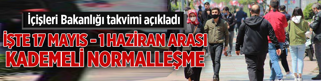 İçişleri Bakanlığı, valiliklere 17 Mayıs – 1 Haziran arası yürürlükte olacak ‘Kademeli Normalleşme Tedbirleri’ konulu genelge gönderdi.