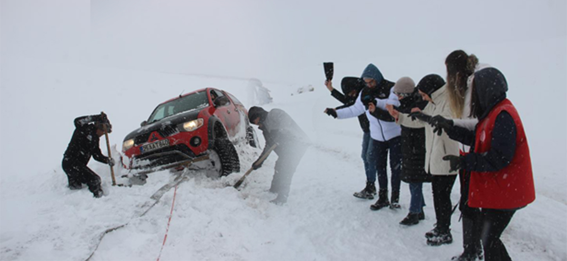 Yurt genelinde 3 gündür etkili olan kar yağışı sonrası Erzurum’da yüzlerce mahalleye ulaşım sağlanamıyor. Köy çocuklarına bot, mont ve eldiven götürmek için yola çıkan Macera Off-Road ekipleri ise Pasinler ilçesine bağlı Başören Mahallesine gittikleri sırada defalarca kara saplandı. Araçlar halat ve küreklerle uzun uğraşlar sonucu çıkartılsa da ekipler ilerlemekte zorluk çekti.
