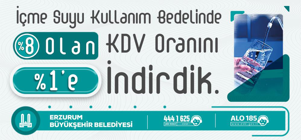 Erzurum Büyükşehir Belediyesi, mesken, iş yeri, sanayi, inşaat başta olmak üzere tüm abone türlerinde su kullanım bedelinde KDV oranını yüzde 8’den yüzde 1’e indirdi.