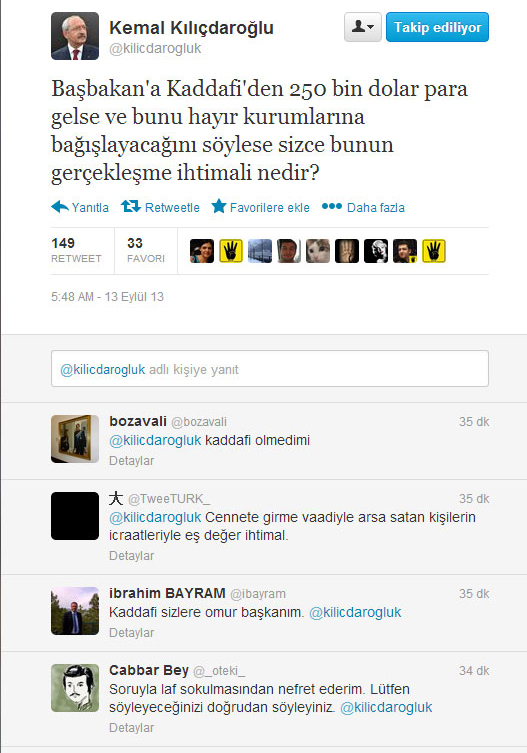 ‘Başbakan’a Kaddafi’den 250 bin dolar para gelse ve bunu hayır kurumlarına bağışlayacağını söylese sizce bunun gerçekleşme ihtimali nedir?’ tweet’ini atan Kılıçdaroğlu’na Kaddafi’nin hayatta olmadığını takipçileri hatırlattı.